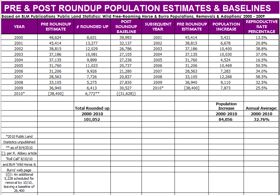 The total Wild Horse & Burro populations removed from the range are based on information published by the Bureau of Land Management. http://www.blm.gov/public_land_statistics/index.htm. The total animals removed for 2000 – 2010, as of 8/4/2010, are 101,052. The estimated population increase for the same period, based on published Pre-Round Up totals, is 84,056. Roundups have exceeded estimated population increases by 16,996, further calling into question the Bureau’s assertion of 38,400 Wild Horses & Burros for 2010 (31,628, post-round up as of 8/4/2010) as a highly optimistic and unrealistic estimate.