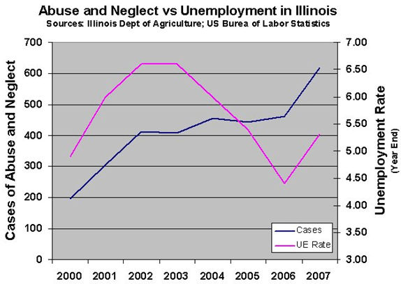 Next, it is necessary to understand what really causes neglect, and that is unemployment. After years of studying the relationship between neglect rates and slaughter volumes, I had concluded that there was no relationship whatever. Then I looked at the rates of neglect in Illinois in comparison with unemployment in the state. The correlation was striking.
