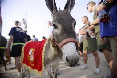 In this Sept. 11, 2008 photo provided by the Department of Defense and Retired Marine Col. John Folsom, Smoke the Donkey takes part in a Freedom Walk event at Camp Taqaddum, Iraq. It took 37 days and a group of determined animal-lovers, but the donkey from Iraq is now a U.S. resident. Smoke The Donkey, who became the friend and mascot of a group of U.S. Marines living in Iraqs Anbar Province nearly three years ago, arrived in New York this week aboard a cargo jet from Turkey. After being quarantined for two days he was released Saturday and began road trip to Omaha, Nebraska, where he is destined to become a therapy animal. (Photo Department of Defense)
