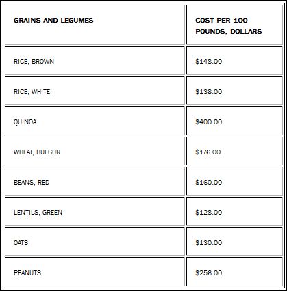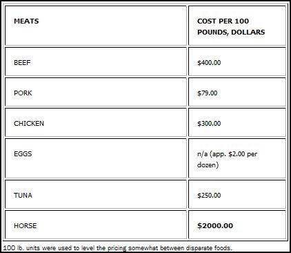 ( Protein values – except for horse meat – were compiled from calorieking.com.Costs per pound for grains and legumes were calculated from bulk food items at Amazon.com. Costs per pound for meats were gathered from various sites offered by ask.com. and usda.gov)