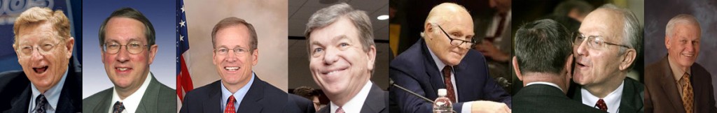 From left to right: ex-US Senator and AQHA lobbyist Conrad Burns, Reps. Bob Goodlatte and Jack Kingston, Senators Roy Blunt and Herb Kohl, ex-US Senator Larry Craig, and horsemeat lobbyist “Chuck” Stenholm. In all fairness, horse slaughter lobbyist Sue Wallis has gained in her own right a seat in the Hall of Shame despite not being a federal legislator.