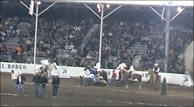 The collision happened during the wild horse race, one of the rodeo’s signature events. Two horses were speeding around in circles in opposite directions and hit head-on at full gallop.