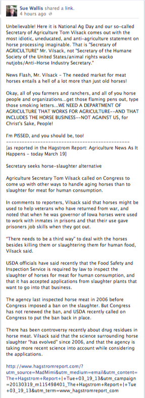 I wanted to take this opportunity to share with you, Wyoming House Representative, Sue Wallis’s, Facebook ramblings regarding your recent statement on the horse slaughter permit issue. First, I thank you for your stance on recognizing our horses deserve a better end than slaughter and the public, be they foreign or domestic have the right to know the food they are eating is safe for human consumption.
