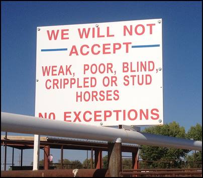 Ok the SIGN in the photo NEEDS SENT TO CONGRESS!!!! Repeatedly, we are bombarded with the facts of slaughter-the old, infirmed, underweight, starved, debilitated, crippled, sickly, injured, and unhealthy animals, blind, unmanageable stallions etc. that NEED to be disposed of to slaughter-REALLY???? That’s NOT what the Killer Lot Sign says! It says-the activists and the REAL HORSE PEOPLE were right, we only require healthy horses in perfect condition. So please. Lets point at this EVERYWHERE! This is HOW They DUPE the Public to believe the sick, unhealthy, etc will have a place to go to cure their suffering….the lies are being revealed but NOT fast enough-so we need to expose these lies for what they are LIES! I am sorry but WE ALL work together to battle this crazy industry and the mental leaders they have engaged to do the dirty work of manipulating the public and we have to change the public views QUICKLY! We need more people to open their eyes-