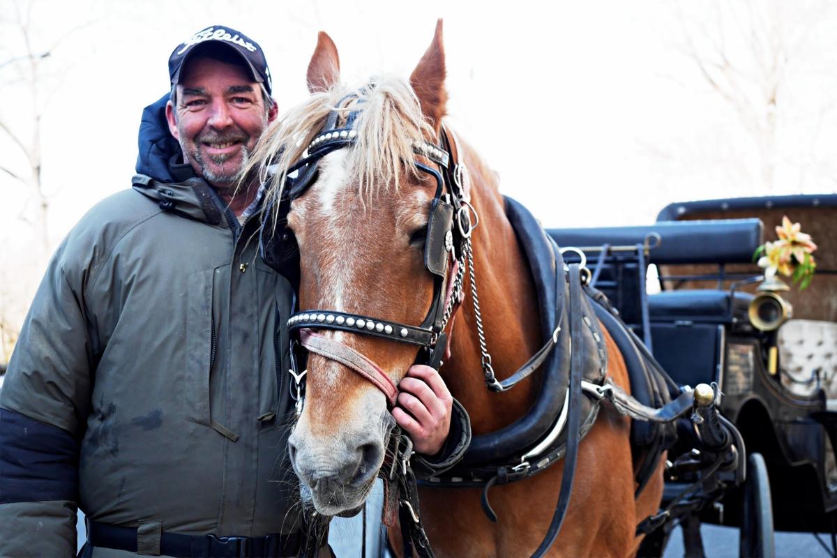 Carriage horse, Roger and his owner, Ian McKeever, pose for one of their final photos in Central Park on Monday, the day before Roger heads to retirement pastures in Syosset.