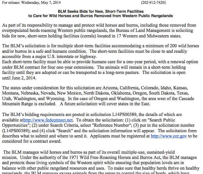 BLM Seeks Bids for Additional Short Term Wild Horse and Burro Concentration Camps