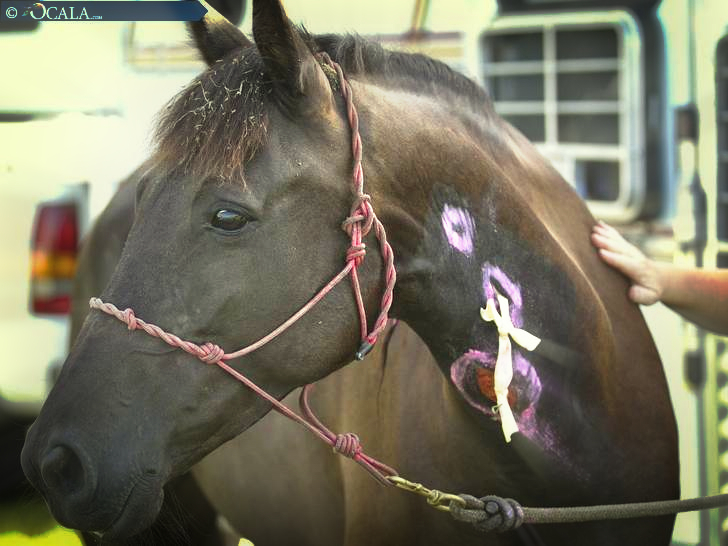 Penrod drains hang out of Kate’s wounds as she was well enough to attended the Poker Ride For Kate in Memory of Jolean Sunday morning, June 29, 2014, at the Florida Horse Park in Ocala, FL.
