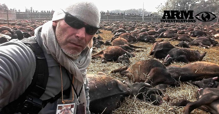 “Ethically, I was so sickened by the lack of enforcement of this industry,” he says, that he began doing his own SPCA investigations. But “so many death threats started to come in that they basically told me to throw out my files or leave. I left and started ARM to fight illegal horse slaughter and extreme animal cruelty.” Now, he says, he operates in 12 counties in Florida, in 20 states, and in dangerous places around the world, including Juarez, Mexico — where murders happened a block away — and in Nepal, where a religious festival called Gadhimai includes the slaughtering of 400,000 animals.