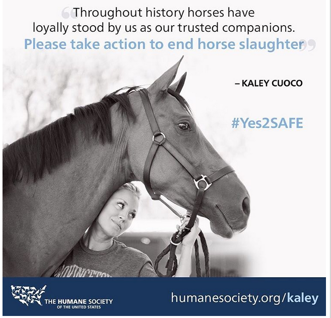 A shocking new discovery about horse meat has prompted Cuoco to urge her fans to pressure lawmakers to vote yes on the The Safeguard American Food Exports (SAFE) Act. Horse meat — mislabeled as meat from other species — has been discovered in the U.S. food supply, and is dumped on the dinner plates of unsuspecting consumers — many of whom oppose the slaughter and consumption of horses.