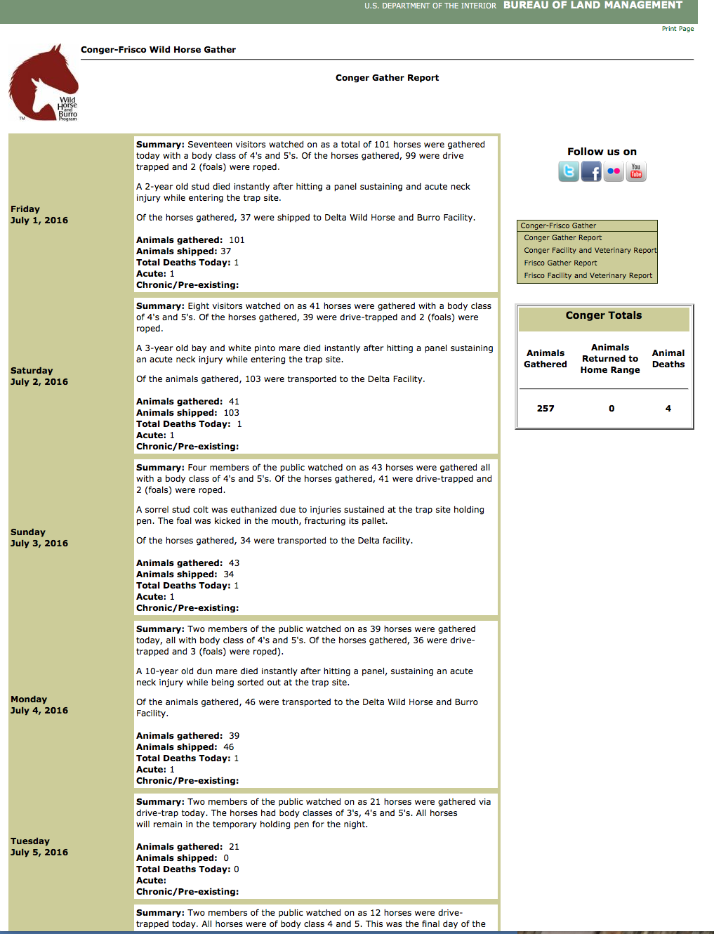 According to the BLM, as of yesterday, 258 wild horses had been captured and permanently removed from the Conger Herd Management Area (HMA). Four horses have died from traumatic injuries: