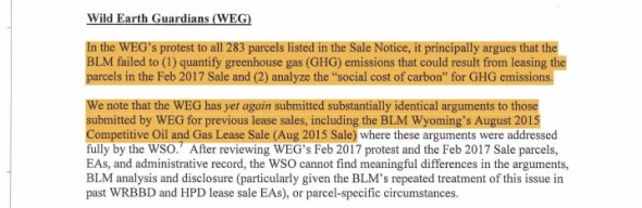 The Wyoming BLM continues to refuse to analyze the cumulative climate impacts even when the lease sales are occurring at the same time and in the same state (not to mention the 1 million plus acres leased in the West 2017). And, Wyoming continually touts the benefits of oil and gas while failing to even attempt to look at the social costs of releasing more carbon into our atmosphere (a requirement that two courts recently re-affirmed).
