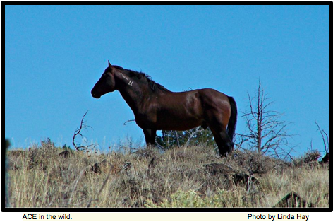 While trying to find and acquire a Twin Peaks wild horse named BraveHeart, we went to the BLM holding facility. In the “possible release” pen, was a bay stallion with a large white star. From seeing him on a website, we knew he had been magnificent and had a beautiful large family on the range. Looking at him in the small dirty pen he almost did not seem like the same horse but because this horse had only one ear (the other ear is there but it flops down – maybe from a past stallion fight) we knew it was him. The horse we saw at the BLM facility hung his head and was withdrawn and obviously depressed – a very sad sight. All of a sudden out of the blue, my daughter said to me, “His name is ACE – he told me”. Why ACE? Because he had only one ear and because he was a number one kind of guy … although on that day we did not know how special he would later become to us. We left the facility devastated that BLM had allowed our chosen BraveHeart to “disappear” … as so many wild ones do in their hands. Soon afterwards we discovered that the big bay stallion was not chosen to be returned to his range … and would be gelded and sent to a long-term holding facility … never to be free again. This only added to the sickening feeling that my daughter and I had experienced when we discovered the stallion BraveHeart had undergone the same treatment. We could not allow it to happen again.