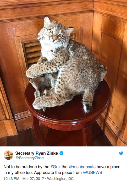 3. The stuffed bobcat has NO PLACE in his office or anyone else’s office … it had a right to live and die in the wild as did the grizzly and other wild animals.