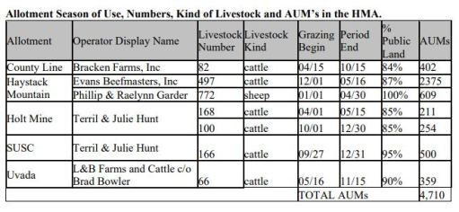 While allowing only 40-60 wild horses, the BLM will allow these numbers of privately owned livestock on public lands (remember that the BLM counts a cow/calf pair as only one animal, so the cattle numbers will double). 40-60 wild horses is not a high enough number for a viable herd. BLM is managing wild horses for extinction.