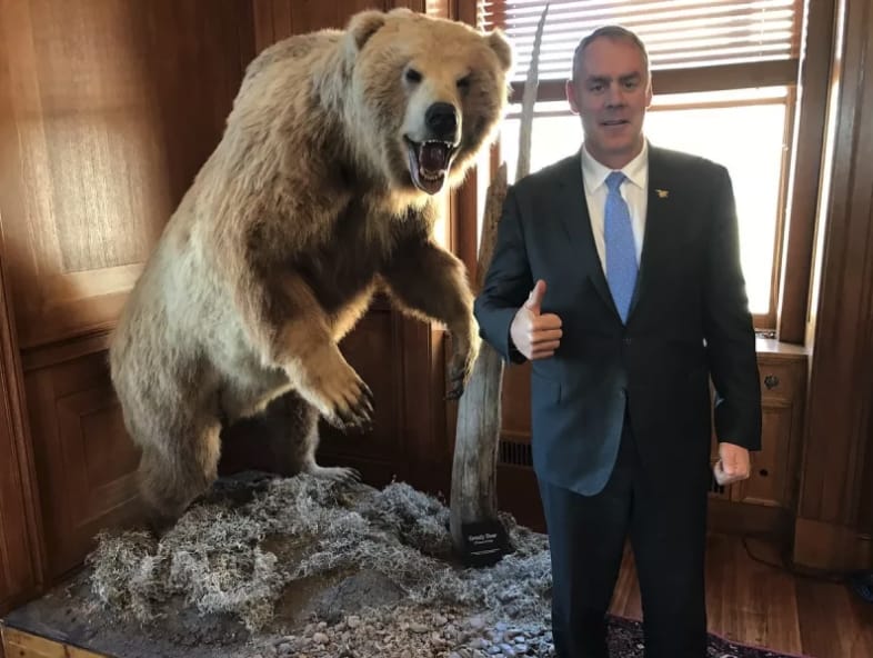 One of the reported conditions of Zinke’s ignominious exit was that it not prevent him from hosting a Christmas party in his animal-carcass-adorned executive offices, where he was said to have posed with conservative activists and lobbyists next to a dead polar bear while sporting a Santa hat.