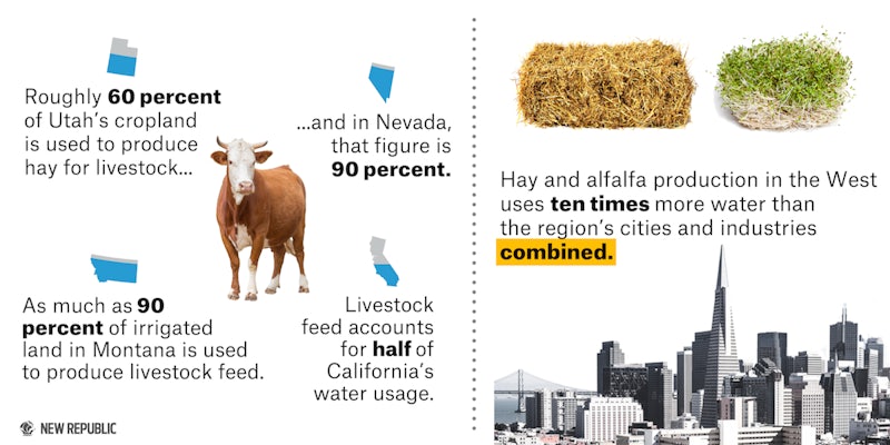 We’d do better to look at what we eat when casting about for villains of the water drama. Food production consumes more fresh water than any other activity in the United States. “Within agriculture in the West, the thirstiest commodity is the cow,” says George Wuerthner, an ecologist at the Foundation for Deep Ecology, who has studied the livestock industry. Humans drink about a gallon of water a day; cows, upwards of 23 gallons. The alfalfa, hay, and pasturage raised to feed livestock in California account for approximately half of the water used in the state, with alfalfa representing the highest-acreage crop. In parts of Montana, as much as 90 percent of irrigated land is operated solely for the production of livestock feed; 90 percent of Nevada’s cropland is dedicated to raising hay. Half of Idaho’s three million acres of irrigated farmland grows forage and feed exclusively for cattle, and livestock production represents 60 percent of the state’s water use. In Utah, cows are the top agricultural product, and three-fifths of the state’s cropland is planted with hay. All told, alfalfa and hay production in the West requires more than ten times the water used by the region’s cities and industries combined, according to some estimates. Researchers at Cornell University concluded that producing one kilogram of animal protein requires about 100 times more water than producing one kilogram of grain protein. It is a staggeringly inefficient food system.