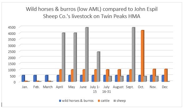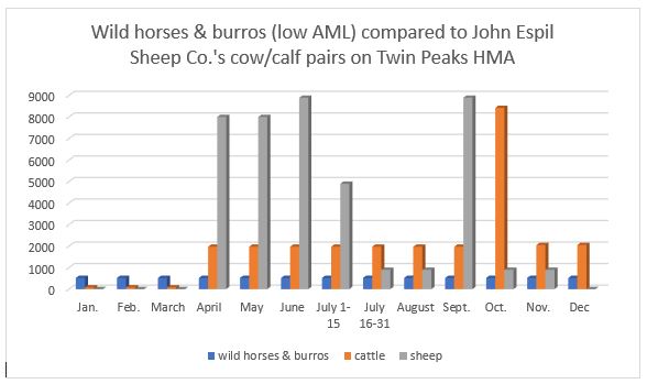 WHFF’s comment on this: How can there be a “thriving natural ecological balance” or a fair “multiple-use” relationship on BLM-administered public lands in the Twin Peaks HMA when just one permittee, Espil Sheep Co., for 9 months out of the year, has more privately owned livestock grazing on Twin Peaks HMA than the LOW AML of wild horses and burros listed as the proposed action of this EA? WHFF prepared this graph using data from authorizations listed on BLM’s Rangeland Administration System (RAS):