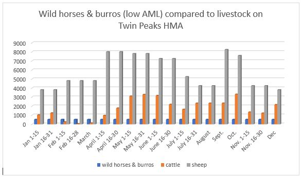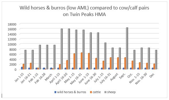 - “…These terms and conditions serve to minimize livestock grazing impacts to vegetation during the growing season and to riparian zones during the summer months. Wild horses and burros, however, are present year-round, and their impacts to rangeland resources cannot be controlled through establishment of a grazing system, such as for livestock. Thus impacts from wild horses and burros can only be addressed by limiting their numbers to a level that does not adversely impact rangeland resources and other multiple uses. WHFF’s comment on this: Using the BLM’s Rangeland Administration System (RAS) data for the allotments on the Twin Peaks HMA, Wild Horse Freedom Federation prepared this graph based on the authorized numbers of livestock for each allotment. It is obvious that while the BLM has characterized some grazing allotments as being “minimized,” this use is favored over wild horses and burros. Also, privately owned livestock are present and graze year-round on Twin Peaks HMA.