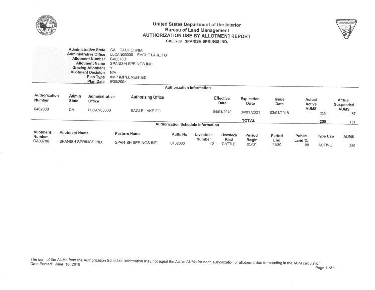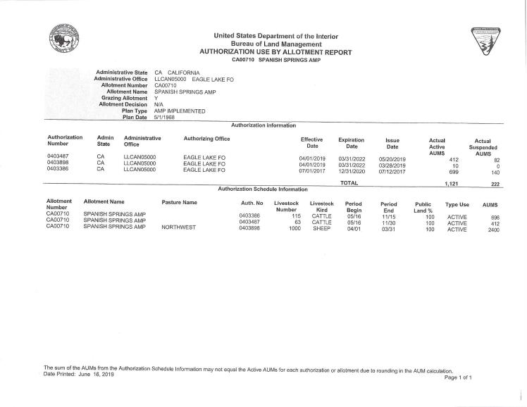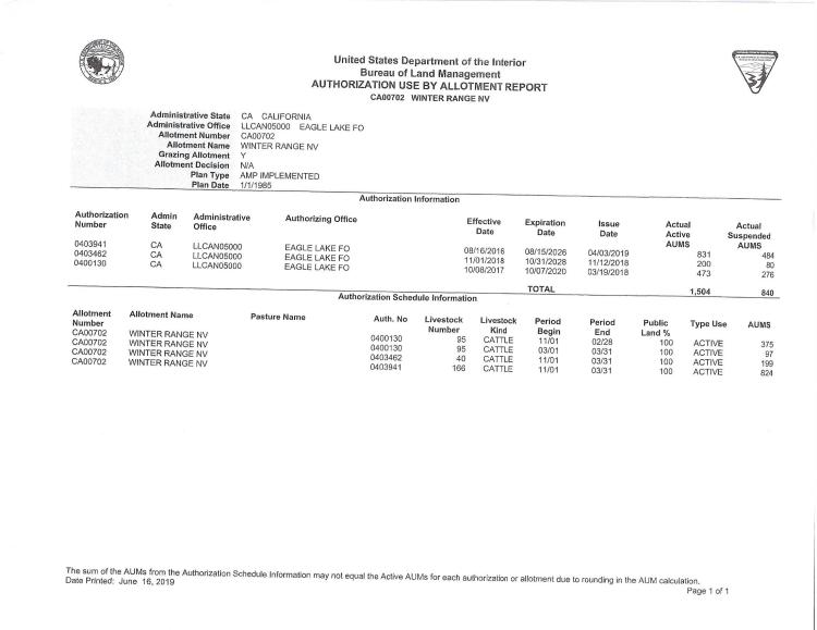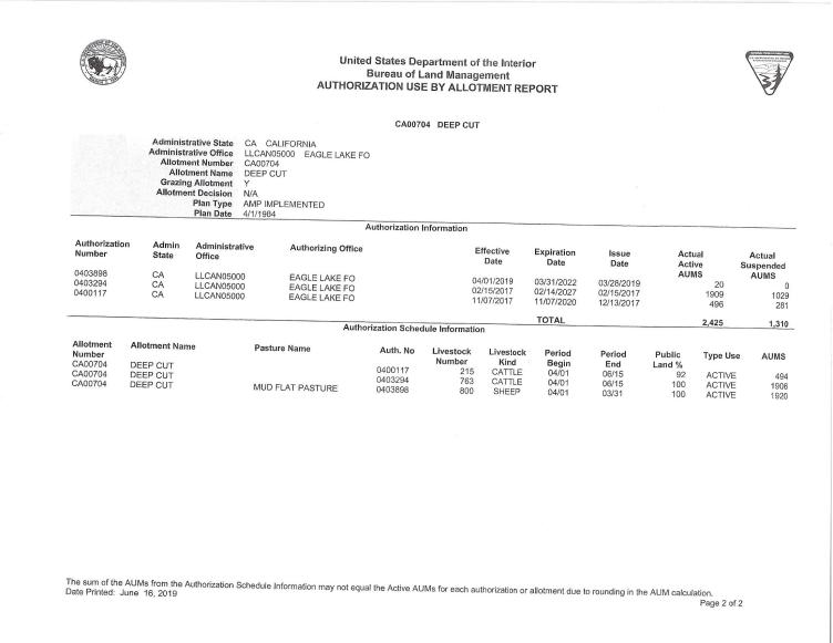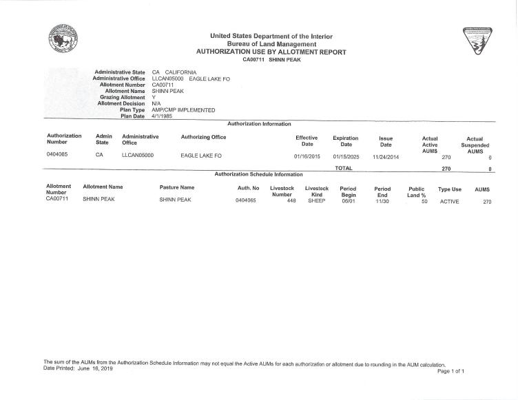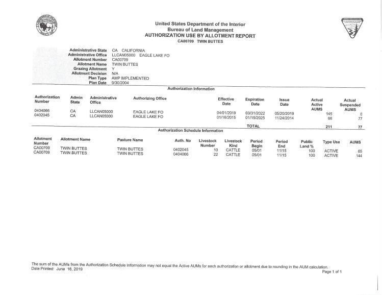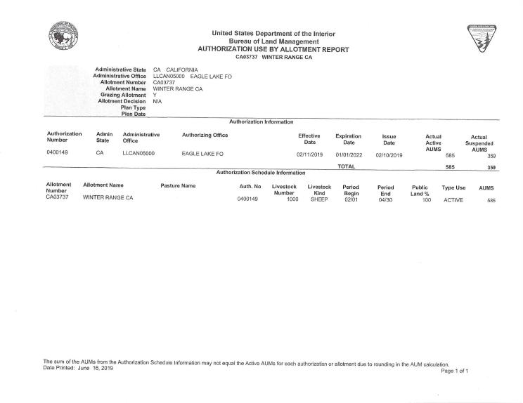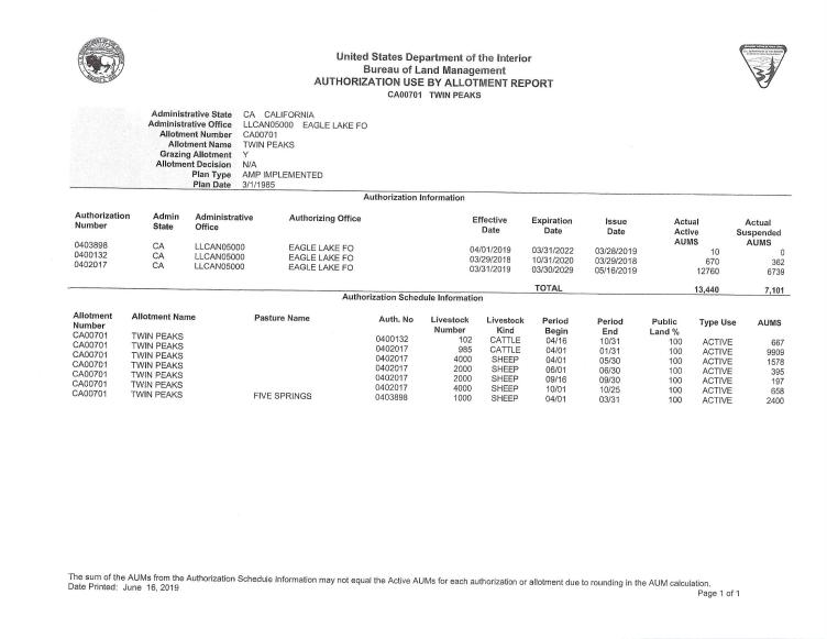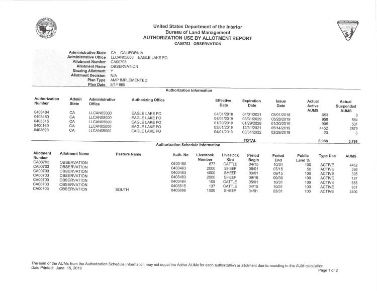 There are a total of nine livestock operators who are currently authorized to graze livestock in these allotments annually. The cattle and sheep operators are authorized to use a total of 26,644 AUMs of forage each year. An AUM is the amount of forage needed to sustain one cow, five sheep, or five goats for a month.