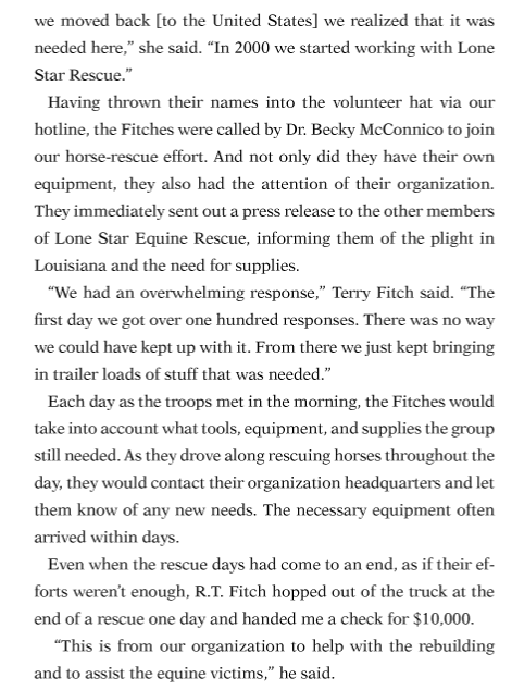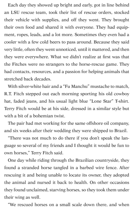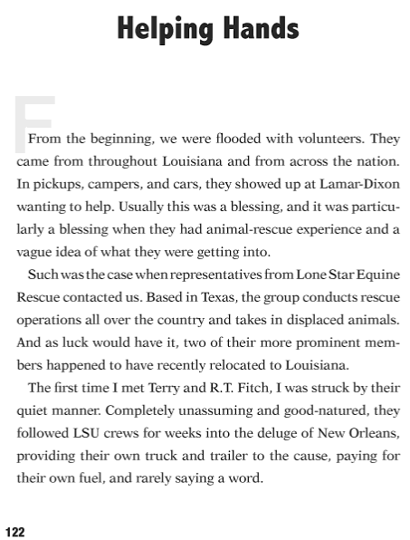 “In late August of 2005 Terry and I had the privilege of working beside the Louisiana State University’s Equine Rescue Team while rescuing not only horses but all sorts and types of animals after the devastation of Hurricane Katrina. It was life changing stuff and thanks to the book, below, Ky Mortensen documented the efforts and has even provided a guide for others to prepare and recover from such devastation. Click on the book cover, below, to learn more. But in the meantime, in honor of the dedicated work that my wife, Terry, accomplished during Katrina and several weeks later with Rita, I share a kind excerpt from Ky’s book for your preview, today. Stay safe.” ~ R.T.