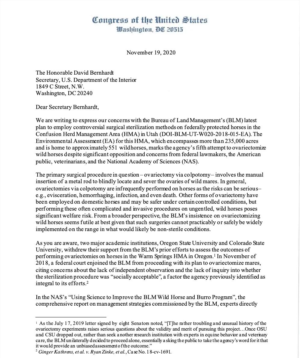 “In general, ovariectomies via colpotomy are infrequently performed on horses as the risks can be serious – e.g., evisceration, hemorrhaging, infection, and even death,” the Congressional letter stated. “Other forms of ovariectomy have been employed on domestic horses and may be safer under certain controlled conditions, but performing these often complicated and invasive procedures on ungentled, wild horses poses significant welfare risk. From a broader perspective, the BLM’s insistence on ovariectomizing wild horses seems futile at best given that such surgeries cannot practicably or safely be widely implemented on the range in what would likely be nonsterile conditions.”…(CONTINUED)
