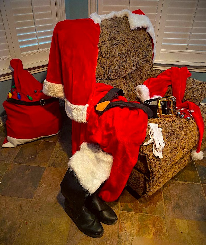 Carefully draped over the back of my easy chair was my bright red, furry Santa coat with the matching pants and suspenders laid across one arm.  The simulated fur topped boots were propped up against the sides with the white gloves, big buckled belt, jingle bells and the signature 5’ cap on the seat.  All resting, all silent, a whisper of magic still lingering in the air.