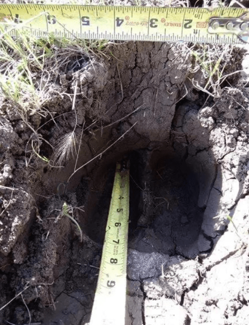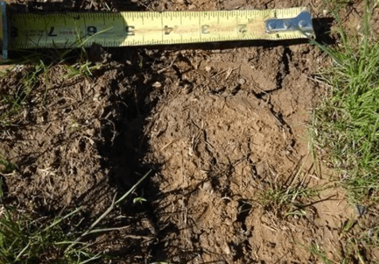 NOTE: The photos below show cow claw and horse hoof penetration depths in a native pasture. They were all taken in the same immediate area (by the author) where cattle and horses had walked in a native pasture on the same morning.