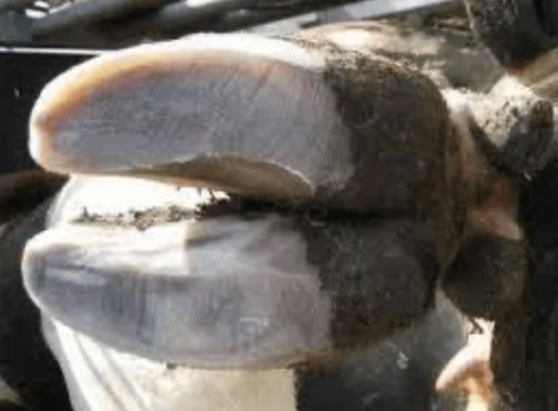 The photo above shows the underside of a cow’s hoof, which as we see, has what are termed as pointed claws. Like the point of a pick-axe tool, the points on these cow claws are very effective at penetrating deeply into soils, especially soft or wet soils. We also note that these claws present a relatively small surface area (pounds/square inch loading) upon which the entire weight of the cow is supported. And this point is obvious on its face.