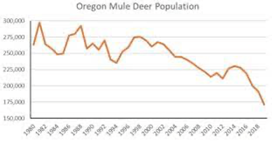 The graph above shows that Oregon’s mule deer population is down about 125,000 animals over the past 4-decades, and this graph doesn’t account for the added drop in black-tail deer populations of about 150,000 black-tail deer. The larger mule deer consume about 10-pounds of grass and brush daily, compared to 7-lbs./day by black-tail deer. These now missing mule deer had been consuming about 228,000-tons of grass and brush annually in Oregon. The depleted black-tail deer in Oregon estimated to be down by 150,000 animals were consuming about 192,000-tons of grass and brush. As a result, it is arguable that approximately 420,000-tons of annual grass and brush wildfire fuels are no longer being mitigated in Oregon.