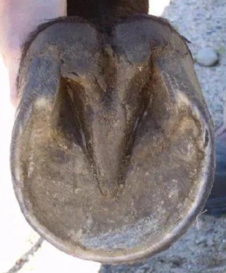 In the photo above we see the underside of a horse’s hoof. It is distinctly different from the cow’s claw in many ways that protect the soils where they tread. First off, the shape is as we see rounded and the surface area is relatively large (lower ground loading in pounds/square inch). The hoof is dished-in on the underside (concave) and that shape tends to trap water and air under the hoof and allows it to ‘float’ hydraulically on the soil instead of piercing the soil like the pick-shaped cow claw.
