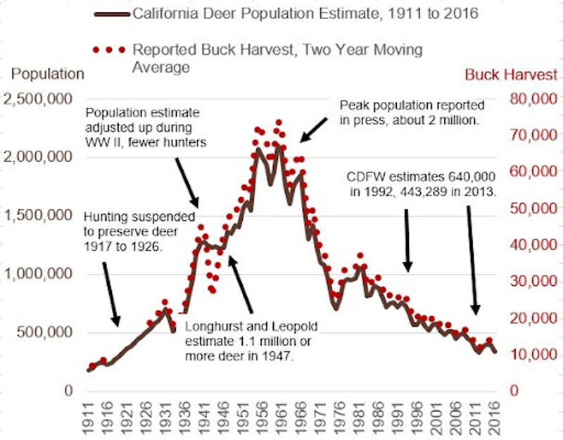 Using the foregoing math, the now missing 2.5-million deer are no longer reducing wildfire fuels at the rate of 3.2-million tons of grass and brush fuels annually in California.