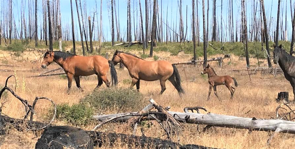 This photo shows an area in the BLM Herd Management Area (Pokegama) which burned during the Oregon Gulch Fire in 2014. The remaining burned trees (dry, pitch-filled wood) are now ready to re-burn even hotter than before. The grass and brush have once-again filled-in and around the dead trees and will assure a future catastrophically hot wildfire. The BLM’s so-called ‘appropriate management level (AML) of 30-50 wild horses in the area (80,885 acres) assigns each horse to approx. 2,000 acres, in an area with a depleted cervid population.