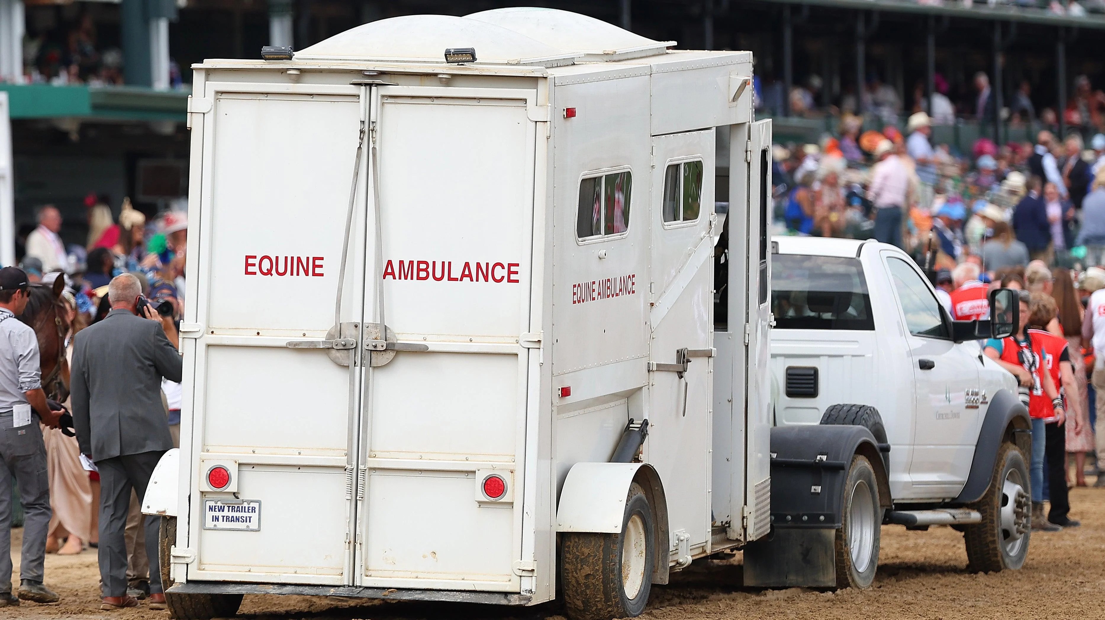 Here Mi Song is driven off in an equine ambulance after racing in the tenth race ahead of the 149th running of the Kentucky Derby.